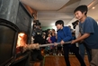 石造りのまきストーブに火をともす神戸市立六甲山小の児童ら=23日午前