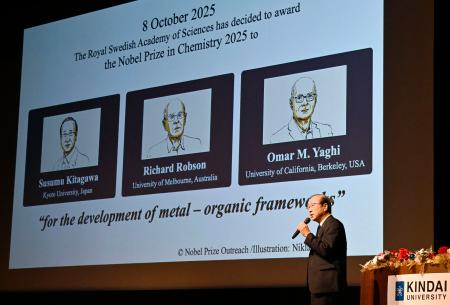 ノーベル賞「国挙げ文化に育成」 古巣・近畿大で北川さん講演 2025/12/24 18:08 印刷 近畿大で講演する京都大の北川進特別教授=24日午後、大阪府東大阪市 記事へ戻る 関連記事 北川さん、授賞式終え帰国 「密度高い多忙な1週間」 【日本人両氏にノーベル賞授与】次世代の科学技術に暗雲 物価上昇、現場は苦境 坂口氏「人生で特別な日」 ノーベル式典出席、笑顔 北川進さん受賞を地元祝福 大阪・寝屋川、特別授業も ノーベル受賞2氏、歓談で笑顔 晩さん会で優雅なひととき過ごす 関連記事 北川さん、授賞式終え帰国 「密度高い多忙な1週間」 【日本人両氏にノーベル賞授与】次世代の科学技術に暗雲 物価上昇、現場は苦境 坂口氏「人生で特別な日」 ノーベル式典出席、笑顔 北川進さん受賞を地元祝福 大阪・寝屋川、特別授業も ノーベル受賞2氏、歓談で笑顔 晩さん会で優雅なひととき過ごす きょうの注目記事 神戸市の気象警報、区ごとに発表へ 臨時休校の判断も細分化 12/24 17:50 社会 防災 神戸 三宮再開発の新バスターミナル「バスタ神戸三宮」に 1期ビルに整備 12/24 17:30 社会 三宮再整備 「外部通報」含む全ての公益通報者を保護 兵庫県が要綱改正、1月施行 12/24 18:15 社会 再負託 斎藤県政 県警男性署長を訓戒処分 県警前本部長は監督責任で注意処分 12/24 12:50 社会 みなと銀行、28年度までに純利益150億円超目標 12/24 16:00 経済 みなと銀行 持丸秀樹氏 万博開催で増便、JR加古川線の利用者増加 4~10月 12/24 19:45 N党の立花孝志党首を不起訴 奥谷県議への名誉毀損容疑や尼崎市議選での逮捕致傷容疑 神戸地検 12/24 19:15 社会 立花孝志被告 県警本部の留置施設から神戸拘置所に移送 12/24 11:57 事件・事故 神戸市立学校園で2学期終業式 頑張った子を「名人」認定も 12/24 16:00 神戸 聖夜にきらめく光のアート LED電球600万個「神戸イルミナージュ」 12/24 19:47 社会 神戸 キムラタンが第三者割当増資 前社長清川氏とHIS創業者の沢田氏 12/24 19:33 経済 キムラタン 阪神湾岸地域の高速道路網「早期整備を」 東京で議連総会 12/24 18:15 社会 神戸 地方行政 きょうの注目記事 神戸市の気象警報、区ごとに発表へ 臨時休校の判断も細分化 12/24 17:50 社会 防災 神戸 三宮再開発の新バスターミナル「バスタ神戸三宮」に 1期ビルに整備 12/24 17:30 社会 三宮再整備 「外部通報」含む全ての公益通報者を保護 兵庫県が要綱改正、1月施行 12/24 18:15 社会 再負託 斎藤県政 県警男性署長を訓戒処分 県警前本部長は監督責任で注意処分 12/24 12:50 社会 みなと銀行、28年度までに純利益150億円超目標 12/24 16:00 経済 みなと銀行 持丸秀樹氏 万博開催で増便、JR加古川線の利用者増加 4~10月 12/24 19:45 N党の立花孝志党首を不起訴 奥谷県議への名誉毀損容疑や尼崎市議選での逮捕致傷容疑 神戸地検 12/24 19:15 社会 立花孝志被告 県警本部の留置施設から神戸拘置所に移送 12/24 11:57 事件・事故 神戸市立学校園で2学期終業式 頑張った子を「名人」認定も 12/24 16:00 神戸 聖夜にきらめく光のアート LED電球600万個「神戸イルミナージュ」 12/24 19:47 社会 神戸 キムラタンが第三者割当増資 前社長清川氏とHIS創業者の沢田氏 12/24 19:33 経済 キムラタン 阪神湾岸地域の高速道路網「早期整備を」 東京で議連総会 12/24 18:15 社会 神戸 地方行政 全国海外新着ニュース 全国海外新着ニュース