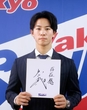 契約更改を終えポーズをとるヤクルトの青柳=15日、東京都内