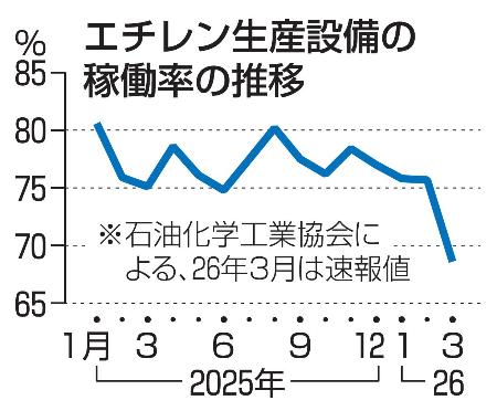 エチレン生産設備、稼働過去最低 3月60%台、原料のナフサ不足 2026/4/23 16:15 印刷 エチレン生産設備の稼働率の推移 記事へ戻る 関連記事 関連記事 きょうの注目記事 東日本大震災15年 「住居を高台に移し安全安心のまちに生まれ変わった」 佐藤・前南三陸町長に聞く 4/23 17:16 社会 東日本大震災 はばタンペイプラス、117万9524人全員の当選発表 兵庫県、住所の虚偽申請あれば無効 4/23 19:42 社会 地方行政 地域商品券・物価高対策 兵庫県への本社転入は113社、転出は80社 賃料高騰の大阪からが7割 25年 4/23 17:23 経済 東証6万円台突破 県内の投資家、歓迎の声と警戒感が交錯 中小企業「恩恵ない」と不満も 4/23 20:10 経済 4月の県内経済情勢 「緩やかに持ち直しつつある」判断据え置き 神戸財務事務所 4/23 19:35 経済 世界最大級の原油タンカー「ハッカイサン」模型 商船三井が神戸大学海事博物館に寄贈 4/23 16:36 県営団地の水道メーター29個盗まれる 被害総額16万円相当 価格高騰の銅が狙いか 姫路市が被害届 4/23 18:23 社会 姫路 ラグビー・神戸スティーラーズ プロップ高尾、後輩との勝負に闘志 25日に東京SG戦 4/23 19:29 スポーツ ラグビー ヒラドツツジ開花 甘い香りと鮮やかな彩り 明石・妙見社 26日に祭典 4/23 19:10 明石 市道の歩道で自転車同士が衝突 男子高校生が車道に転倒、軽トラックと接触し重傷 加東 4/23 16:50 事件・事故 重大交通事故 高校生の保護者の個人情報、一時閲覧可能に 文科省の授業料無償化申請システムで不具合 兵庫 4/23 19:00 能登の高校サッカー部支援 ボールやヴィッセル選手サイン入りユニホーム贈る 神戸南ロータリー 4/23 19:35 経済 能登半島地震 ヴィッセル きょうの注目記事 東日本大震災15年 「住居を高台に移し安全安心のまちに生まれ変わった」 佐藤・前南三陸町長に聞く 4/23 17:16 社会 東日本大震災 はばタンペイプラス、117万9524人全員の当選発表 兵庫県、住所の虚偽申請あれば無効 4/23 19:42 社会 地方行政 地域商品券・物価高対策 兵庫県への本社転入は113社、転出は80社 賃料高騰の大阪からが7割 25年 4/23 17:23 経済 東証6万円台突破 県内の投資家、歓迎の声と警戒感が交錯 中小企業「恩恵ない」と不満も 4/23 20:10 経済 4月の県内経済情勢 「緩やかに持ち直しつつある」判断据え置き 神戸財務事務所 4/23 19:35 経済 世界最大級の原油タンカー「ハッカイサン」模型 商船三井が神戸大学海事博物館に寄贈 4/23 16:36 県営団地の水道メーター29個盗まれる 被害総額16万円相当 価格高騰の銅が狙いか 姫路市が被害届 4/23 18:23 社会 姫路 ラグビー・神戸スティーラーズ プロップ高尾、後輩との勝負に闘志 25日に東京SG戦 4/23 19:29 スポーツ ラグビー ヒラドツツジ開花 甘い香りと鮮やかな彩り 明石・妙見社 26日に祭典 4/23 19:10 明石 市道の歩道で自転車同士が衝突 男子高校生が車道に転倒、軽トラックと接触し重傷 加東 4/23 16:50 事件・事故 重大交通事故 高校生の保護者の個人情報、一時閲覧可能に 文科省の授業料無償化申請システムで不具合 兵庫 4/23 19:00 能登の高校サッカー部支援 ボールやヴィッセル選手サイン入りユニホーム贈る 神戸南ロータリー 4/23 19:35 経済 能登半島地震 ヴィッセル 全国海外新着ニュース 全国海外新着ニュース