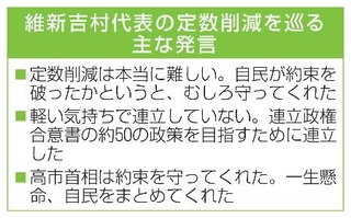衆院議員定数削減法案の議論は来年に持ち越される見通しとなった。前のめりだった日本維新の会は連立政権維持を優先し、自民党との関係を悪化させないようにリスク回避を意識し始めた。連立政権樹立時に合意した政策は定数削減を含め約50に上る。今国会の会期末に合わせ、与党党首会談を開く案も浮上しており、軟着陸を模索する。