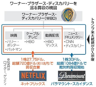 米メディア大手ワーナー・ブラザース・ディスカバリー(WBD)争奪戦が混迷してきた。米動画配信大手ネットフリックスが買収に合意し、いったんは袖にされた米メディア大手パラマウント・スカイダンスが敵対的買収を仕掛け、トランプ米大統領が介入を示唆したためだ。WBD傘下でトランプ氏に批判的な報道姿勢を取るニュース専門局CNNの存在が焦点となっている。