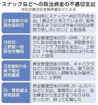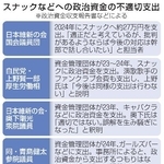 スナックやラウンジでの飲み食いに多額の政治資金を支出していた自民党5府県連の一部は共同通信の取材に「適正に処理した」と回答した。過度な接待が伴う場での飲食でも政治活動に当たり、政治資金を充てても問題ないと言わんばかりの主張だ。政治活動は広範にわたるが、空前の物価高が続く中、こうした言い分は納税者の理解を得にくい。