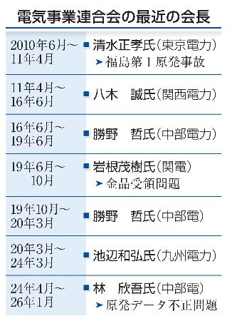 中部電力の林欣吾社長が、業界団体の電気事業連合会の会長辞任に追い込まれた。浜岡原発(静岡県)のデータ不正問題で足元が揺らぎ、任期満了を前に身を引いた。団体トップの会長職を巡っては、原発事故や原発マネーの不祥事でこれまでも途中退場があった。信頼回復が遠のいている。