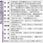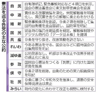 自民党と日本維新の会の連立与党は衆院選公約に、憲法への緊急事態条項創設を掲げた。9条改正も訴えるが、具体的内容には溝がある。立憲民主党と公明党が結成した中道改革連合は改憲論議を「深化」させるとする一方、緊急条項については立場を明確にしていない。高市早苗首相(自民総裁)による突然の衆院解散判断を批判し、解散権の制約を主張する。