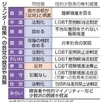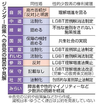 8日投開票の衆院選では、与野党がジェンダー政策を公約や政策集に盛り込んだ。多くの党が男女間の賃金格差是正や女性の待遇改善に向けた施策を列挙し、同性婚やLGBTQ(性的少数者)の権利擁護では濃淡が出た。ただ公示前後の党首討論や街頭演説では、ほとんど話題に上っておらず、実現に向けた本気度には疑問符が付く。