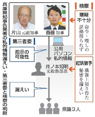 兵庫県の斎藤元彦知事が27日、元県幹部の私的情報漏えい問題を巡って不起訴となった。検察は元総務部長による漏えいを認定したが、斎藤氏の指示は「裏付けができなかった」とした。斎藤氏が元県幹部を「公務員失格」と非難してから2年。さまざまな疑惑で刑事告発されたが、いずれも不起訴となった。告発側は検察審査会への申し立てをする方針で、県庁内からも説明を求める声が上がる。幕引きは遠い。