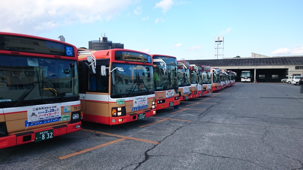 神姫バスの根幹はバス事業です。写真は姫路営業所の様子です。この各車両が地域の皆様の交通網となっています。