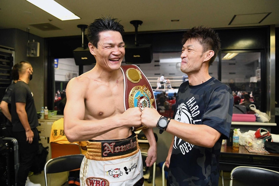 【写真上】WBOアジア・パシフィック王者として2度目の防衛に成功後、喜び合う桂伸二トレーナー(右)と野中悠樹=7月23日、大阪市浪速区、エディオンアリーナ大阪