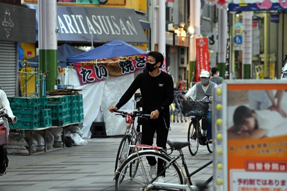 【写真上】練習前の空き時間。商店街をぶらっと歩く野中悠樹=尼崎市内