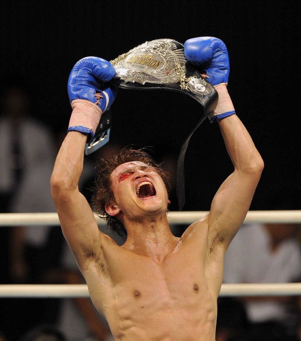【写真上】日本王者に輝き、ベルトを掲げて喜ぶ野中悠樹=2008年9月22日、大阪府立体育会館(山内城司さん提供)