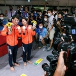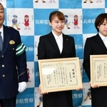 交通安全を呼び掛ける動画に出演するなど啓発活動に協力したとして、いずれも東京五輪に出場した体操の杉原愛子さん(22)=武庫川女子大短大部2年=と飛び込みの荒井祭里さん(21)=武庫川女子大3年=が22日、兵庫県警の矢野浩司交通部長から感謝状を受けた。