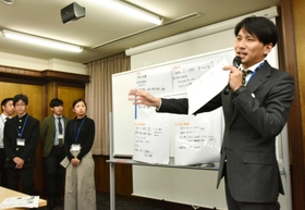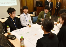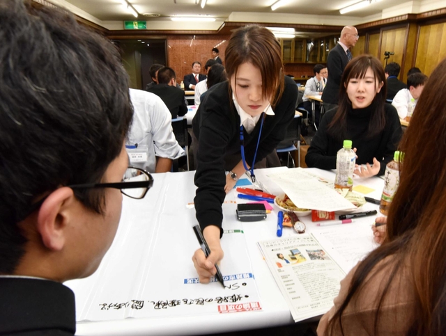 C班はまず「経済振興」のテーマについて「姫路で創業する」という切り口でまとめ「市はすでに図書館に創業応援セミナーなどの開催告知の情報を発信しているがまだPRが足りない。セミナー開催の情報を映画上映前の宣伝や、人通りの多い駅でのポスター掲示で発信しては」とのアイデアを披露。また、「観光振興」のテーマについては「夜の姫路をPRする」方法を提案。「姫路城につながる大手前通はビジネス街で店が閉まるのが早いという課題がある。夜の大手前通に屋台を出すほか、バス、電車の運行時間をより遅い時間に拡大すべき」との意見が出された。