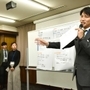 E班は、「広報推進」のテーマについての議論の過程を紹介。「姫路市外の人に姫路城以外で興味をひきつけるには『食』がわかりやすい。姫路おでん、ひねぽん、アーモンドトーストなどがあるが、さらにインパクトが欲しい。姫路城一本押しという方法もある。年間入城者数は200万人近くだが、もっと魅力を広く伝えることも大事ではないか」と投げかけた。