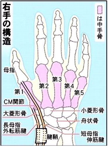 兵庫県尼崎市の主婦辻田典子さん(51)は2010年の夏ごろから、タオルを絞ったり物を握ったりすると、左手親指の付け根がズキズキと痛むようになった。患部は腫れ、次第にこぶのような骨の出っ張りができた。心配になってインターネットの検索サイトで調べると、パソコン画面に見慣れない病名が現れた。