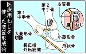 関節形成術の関節機能の残し方は、親指周辺の腱(けん)を利用したり人工関節を使ったりとさまざま。同病院では、第1中手骨と腕の筋肉をつなぐ「長母指外転筋腱」の一部を縦半分に裂き、片方を第1中手骨と第2中手骨に開けた穴に通して、医療用の小さなねじで固定する。他の方法と比べて簡便で、傷も小さい。人工関節を使った場合の破損や素材による炎症といった合併症もなく、痛みを取り除ける。