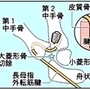 左手のエックス線写真を撮ると、大菱形骨の関節面から第1中手骨が3分の1ほど外側にずれていた。さらに、軟骨がすり減って骨が直接ぶつかり合った所に「骨棘(こつきょく)」と呼ばれる小さな突起が複数見つかった。