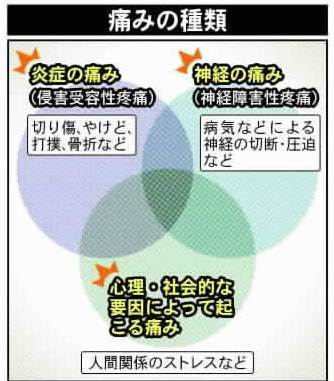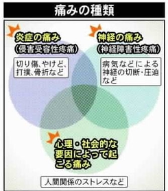 急性は切り傷や骨折、感染症、内臓疾患など炎症が引き金になって起きる「侵害受容性疼痛」で、炎症が引けば痛みも消える。一方、慢性はがん以外の原因でおおむね3カ月以上続く痛みを指す。炎症が長引くことで神経機能が変化するほか、病気やけがで神経そのものが傷つく「神経障害性疼痛」、不安やストレスなど心理・社会的な要因によって起こる痛みなどが複雑に絡み合う。
