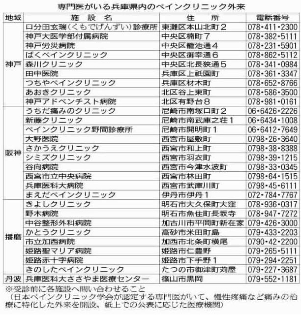 神戸大医学部付属病院(神戸市中央区)麻酔科・ペインクリニック科の高雄由美子医長は「日本人は我慢を美徳とするが、痛みを我慢しても良いことはない」とし、「早く適切に対処することで、慢性化を防げる可能性が高い。まずはペインクリニックを受診先の選択肢に加えてほしい」と呼び掛ける。