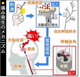 そもそも人は、なぜ痛みを感じるのか。体に傷や熱などの刺激が加わると、細胞から痛みを引き起こすさまざまな化学物質「発痛物質」が放出される。それが末梢(まっしょう)神経の末端「自由神経終末」に備わった受容体にくっつくと、電気信号の発生を促すタンパク質の一種「ナトリウムチャネル」が開き、電気の素「ナトリウムイオン」が自由神経終末内に一気に流れ込む。前田部長は「発痛物質を鍵、受容体を鍵穴、ナトリウムチャネルを扉に例えると分かりやすい」と指摘する。
