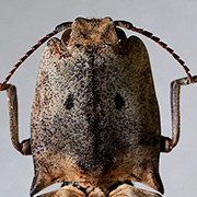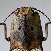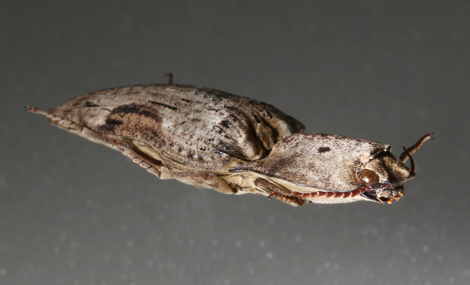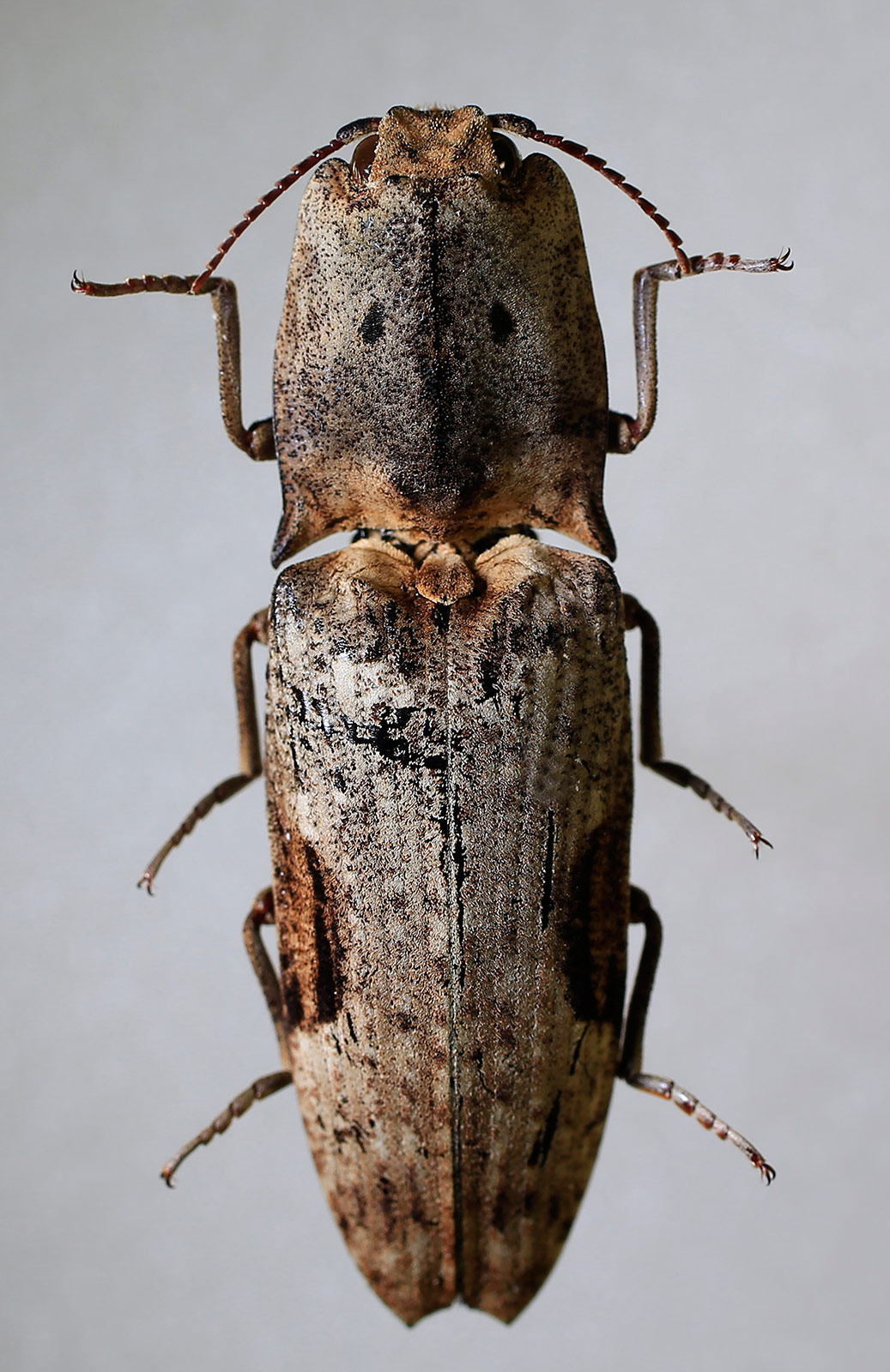 大型のコメツキムシ。逆さにすると、パチンと音を立てて飛び上がる。黒色で灰白色や黄褐色の鱗毛がある。幼虫は広葉樹の朽ち木で育つ。成虫は平地から低山の雑木林で見られる。神戸市内では六甲山系の広葉樹林帯で確認できる。成虫出現期は6~8月。体長約30ミリ。分布は本州、四国、九州、沖縄。