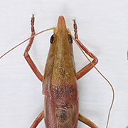 体は細長く、頭は三角型にとがっているのが特徴。大あごは赤褐色。緑色、褐色の個体のほか、赤い個体もいる。指にかみつくと離さず、無理にひっぱると首が切れるので、この名がついたとの説がある。草地に生息、街中でもよく見かる。秋に羽化し、イネ科の草の株などに潜り込んで成虫で越冬する。27~35ミリ。