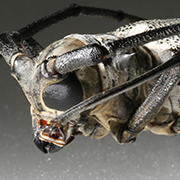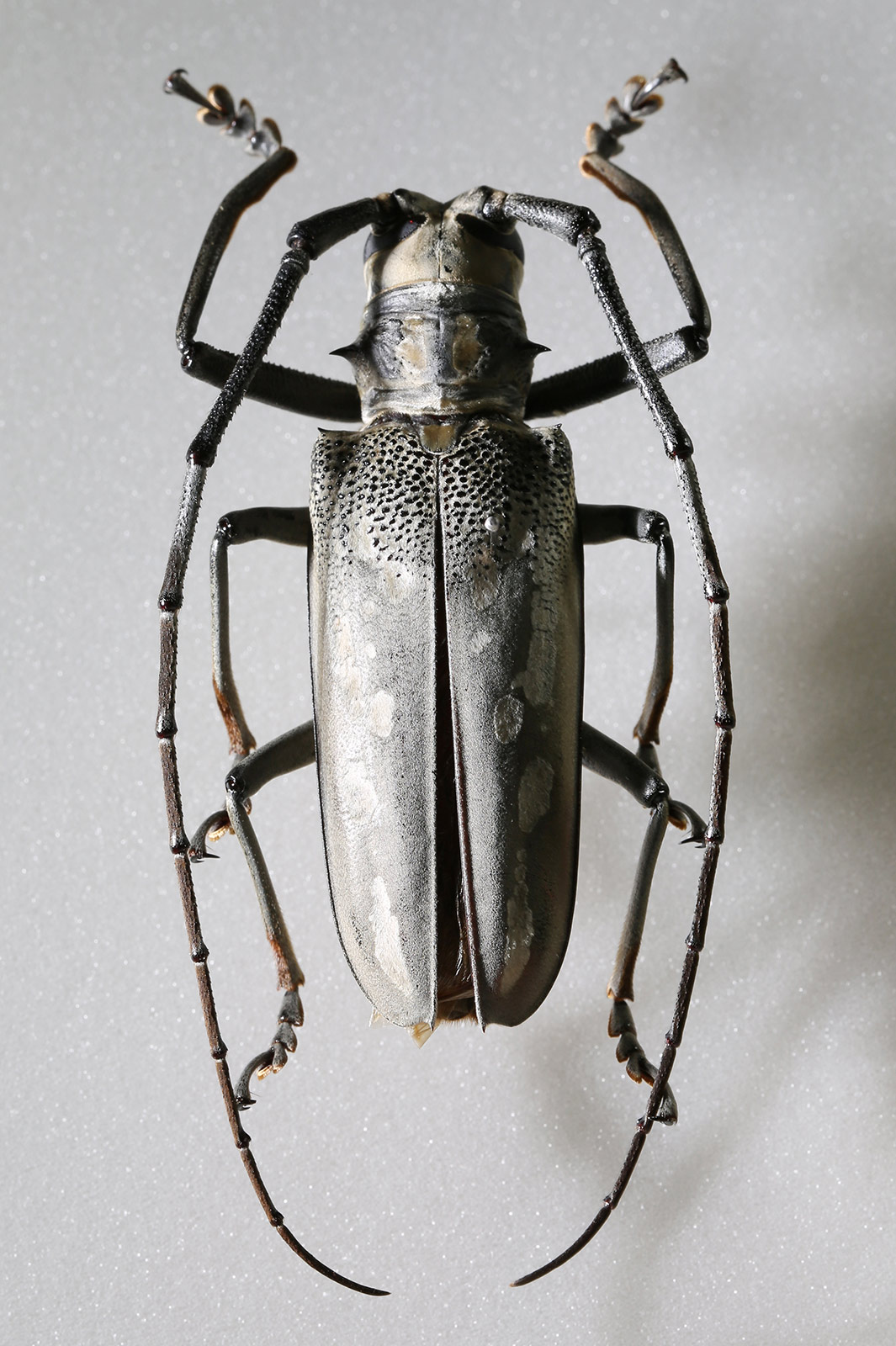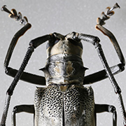 日本最大のカミキリムシ。雑木林で見られる。メスは、クリ、クヌギ、シイの幹に大あごで傷つけて産卵。幼虫は木の幹にくいこみ、生木を食べる。その様子は、鉄砲玉が貫通した穴のように見えるため、「鉄砲虫」との別名も。成虫になるまで3年かかるといわれている。鳥などの捕食動物を驚かせるため、成虫は胸のところとこすりあわせて、キイキイという音をだす。神戸・六甲山系の広葉樹林帯でもよく確認できる。成虫出現時期は6~8月。体長45~52ミリ。