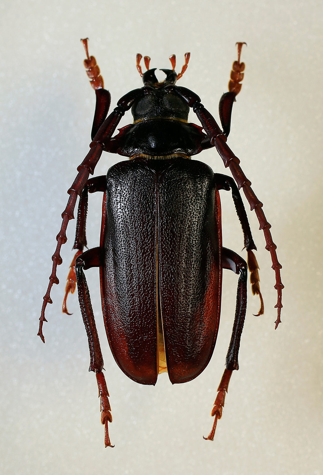 触角がノコギリのようにぎざぎざになっているのが特徴。自分を食べようとする動物を威嚇するため、後ろ足のスネの部分を前羽のふちにこすりつけて、シュッという音を出す。幼虫は、スギ、クヌギなど針葉樹、広葉樹の倒木の中で育つ。成虫の出現期は6~8月。体長23~48ミリ。