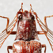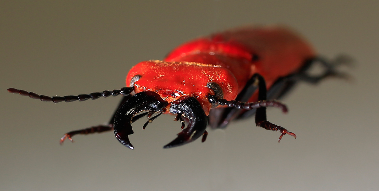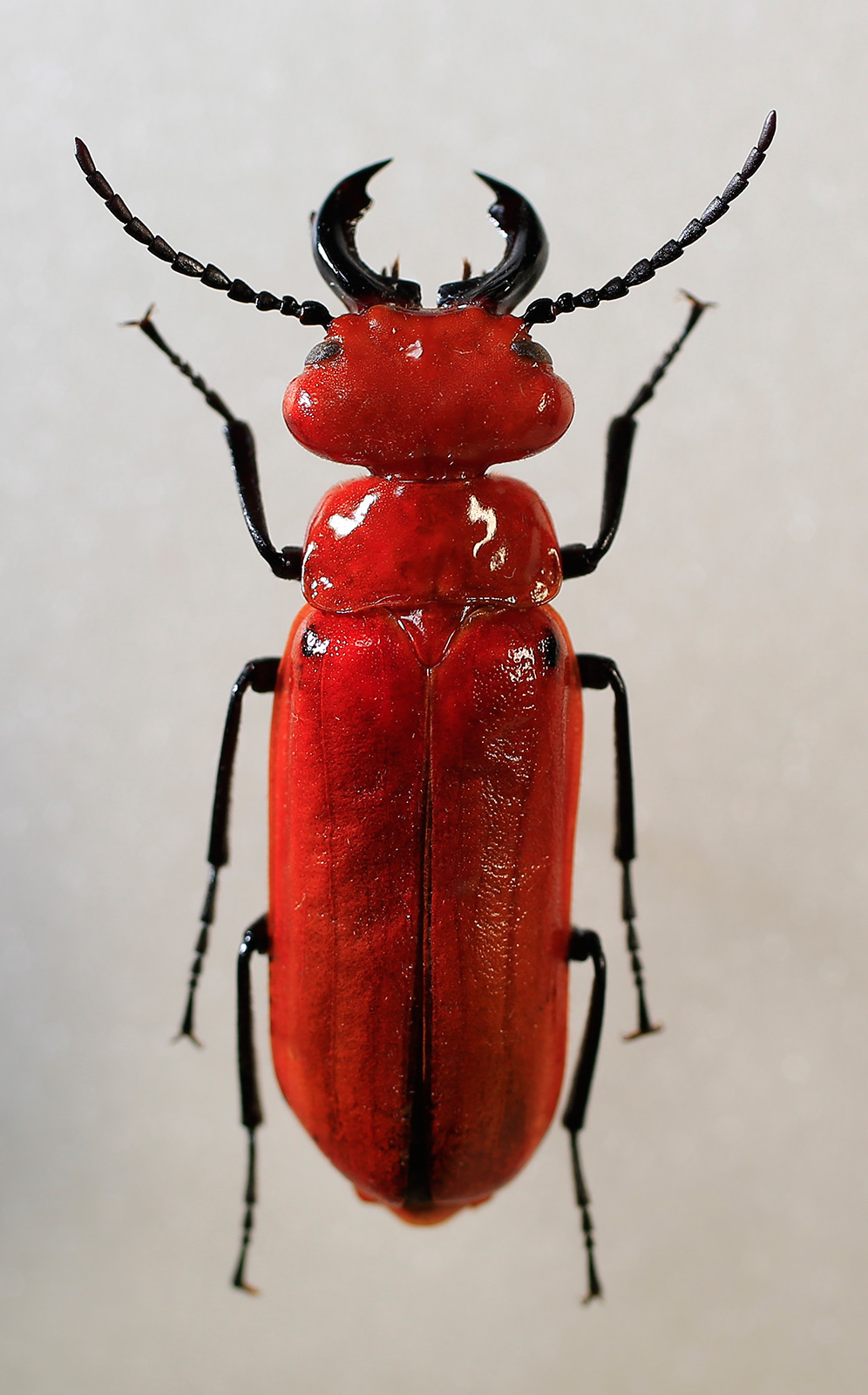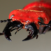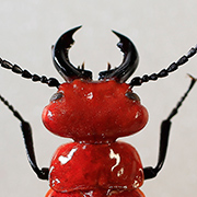赤いクワガタムシともいわれる。オスのアゴは大きく、メスのアゴは小さい「性的二型」の昆虫。アゴはメスの奪い合いで使うが、かまれてもクワガタのようにあまり痛くない。キムネクマバチの巣に寄生し、幼虫は花粉団子やキムネクマバチの幼虫を食べる。よってキムネクマバチが巣がつくりやすい古い家の軒先にいることが多い。都市部の公園ではソメイヨシノなどの横枝に穴を掘って巣をつくる。赤は捕食する鳥への警戒色。毒をもっているサインといわれる。