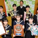 滋賀県であった第30回全国中学校駅伝の女子(5区間12キロ)で、兵庫県勢女子として初めて連覇した稲美中陸上競技部の駅伝チームが22日、同県稲美町立コミュニティセンター(同町国岡1)で中山哲郎町長らに優勝を報告した。厳しい練習に耐え、再び優勝旗を持ち帰った選手たち。レースを振り返り、応援してくれた人たちに感謝しながら、勝利の喜びをかみしめた。