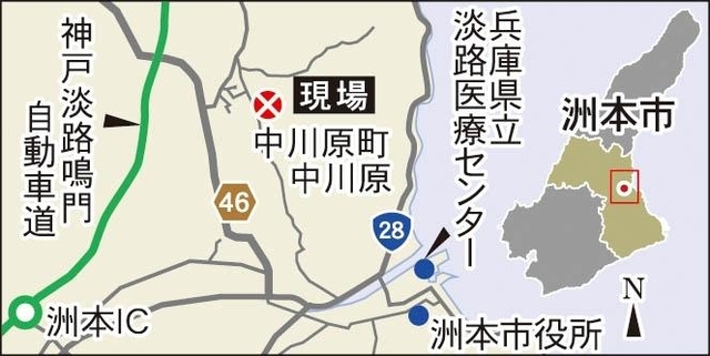 • 5人が刺された民家を調べる捜査員ら=9日午前10時45分、洲本市中川原町中川原
