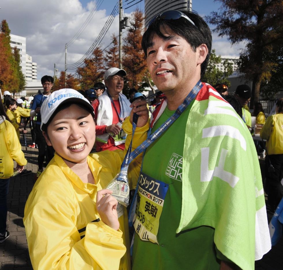 今春から神戸学院大で学ぶ仙台出身の新妻彩乃さん(18)が、父で仙台市立七北田中学教頭の英敏さん(48)の首に完走メダルを掛け、ぎゅっと抱き合った。