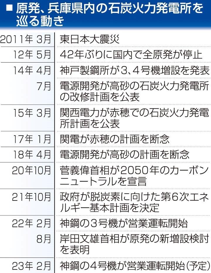 【神戸製鋼所の石炭火力発電所】 一般企業が電気を電力会社に販売する「電力卸供給事業」が可能になり、2002年、神鋼は神戸市灘区の神戸製鉄所(現・神戸線条工場)で発電所1号機を、04年に2号機を稼働させた。14年、廃止を決めた高炉跡地に増設を発表し、22年2月に3号機が稼働し、23年2月に4号機の稼働を予定する。