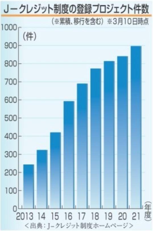 森林保全や省エネ設備導入など、二酸化炭素(CO2)の排出削減量・吸収量をクレジットとして販売する制度は、各地で活用されつつある。政府が認証する「J-クレジット制度」では、登録プロジェクト件数が2021年度は897件(3月10日時点)に上り、5年前の1.5倍に増えた。