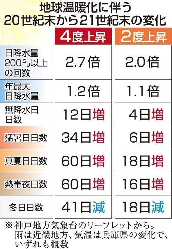 4度上昇する場合と、2度上昇する場合の2パターンを検討。4度上昇の場合、近畿地方では豪雨の頻度が増える一方、雨が1ミリ未満の「無降水日日数」も約12日増加する。最高気温が35度以上の猛暑日は兵庫県内で約34日、最低気温が25度以上の熱帯夜は約60日多くなる。最低気温0度未満の冬日は約41日減る。