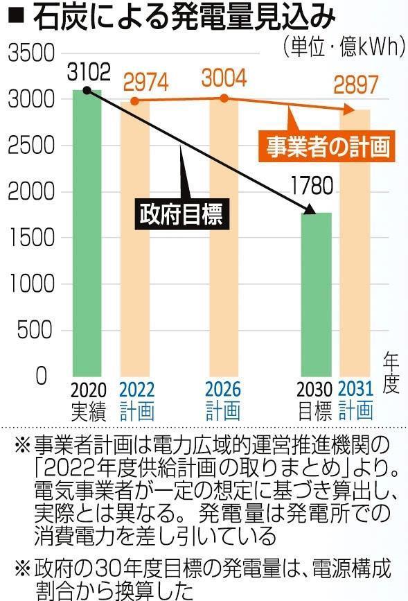 目標達成の危うさは、環境省も指摘していた。石炭火力発電による二酸化炭素(CO2)排出量について、20年7月の試算で、30年の政府目標(当時は26%)と整合する排出量と比べ、5千万トン程度超過する可能性を示した。現在の目標(19%)で換算すると1・1億トンの超過となる。