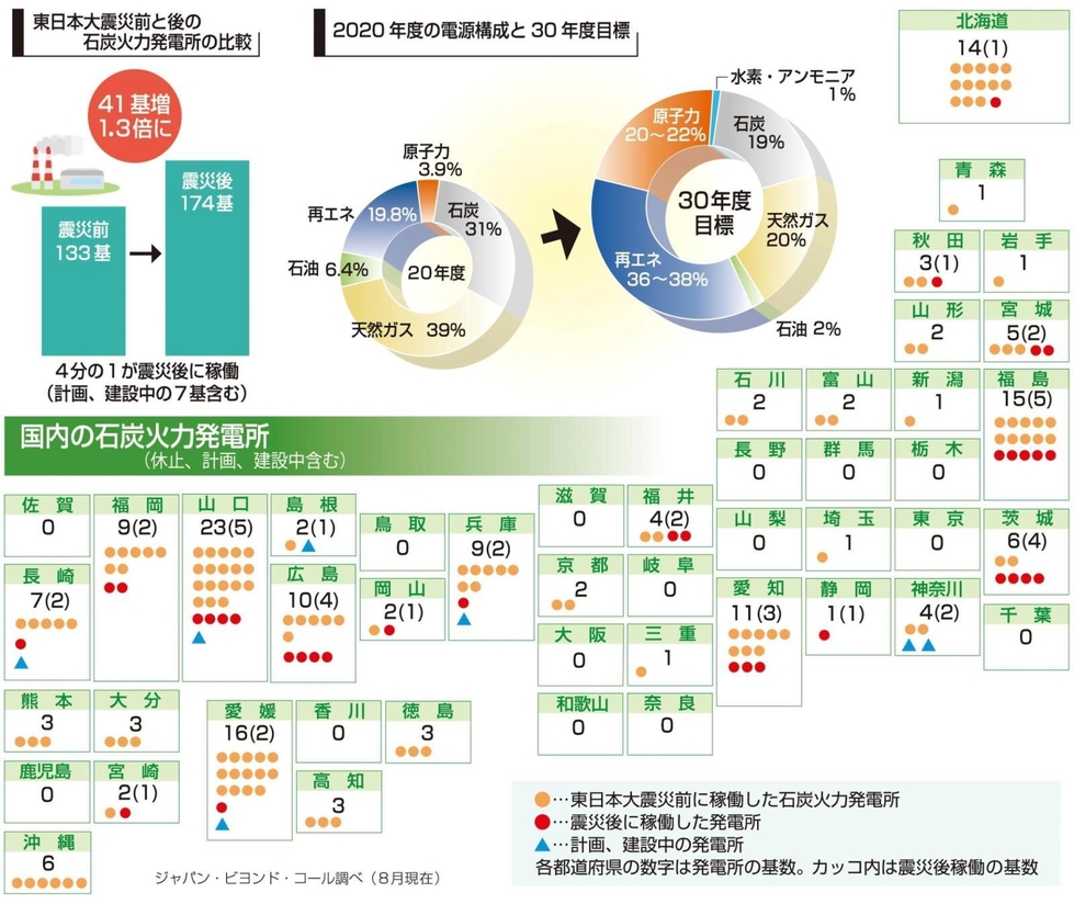 国内の環境団体でつくる「ジャパン・ビヨンド・コール」によると、今年8月時点で運転中の石炭火力発電所は167基(休止中の3基を含む)に上る。計画・建設中の7基を合わせると、震災前の133基から1・3倍となる。