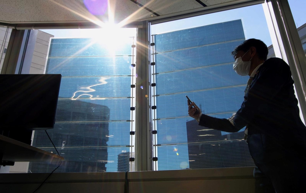 窓ガラスに張られたフィルム状の太陽電池。半透明で奥に光る太陽も見える=神戸市中央区西町(撮影・中西大二)