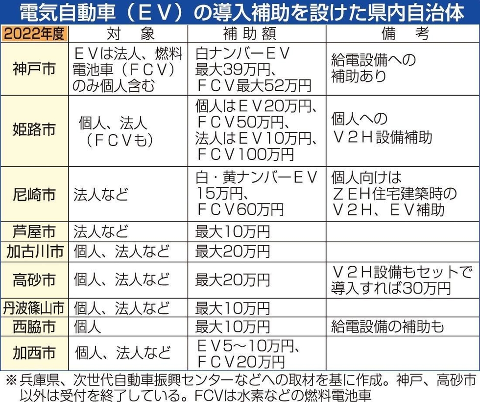 国の制度と並行して、各自治体の補助も利用できる。兵庫県内で22年度、EV購入の個人向け助成制度を設けたのは6市。22年度から個人向け助成を始め、半年ほどで予算枠が一杯になった姫路市は「軽EVの発売もあり、申し込みが多かった」。加古川市や丹波篠山市は申請の多さに予算を増額して対応した。