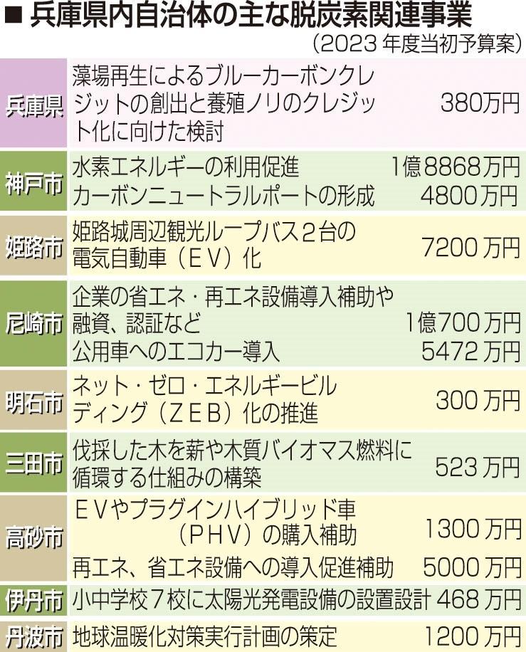 兵庫県内各市町の2023年度予算案には、国が掲げる50年のカーボンニュートラル(温室効果ガス排出の実質ゼロ)に向けた各種施策が盛り込まれた。
