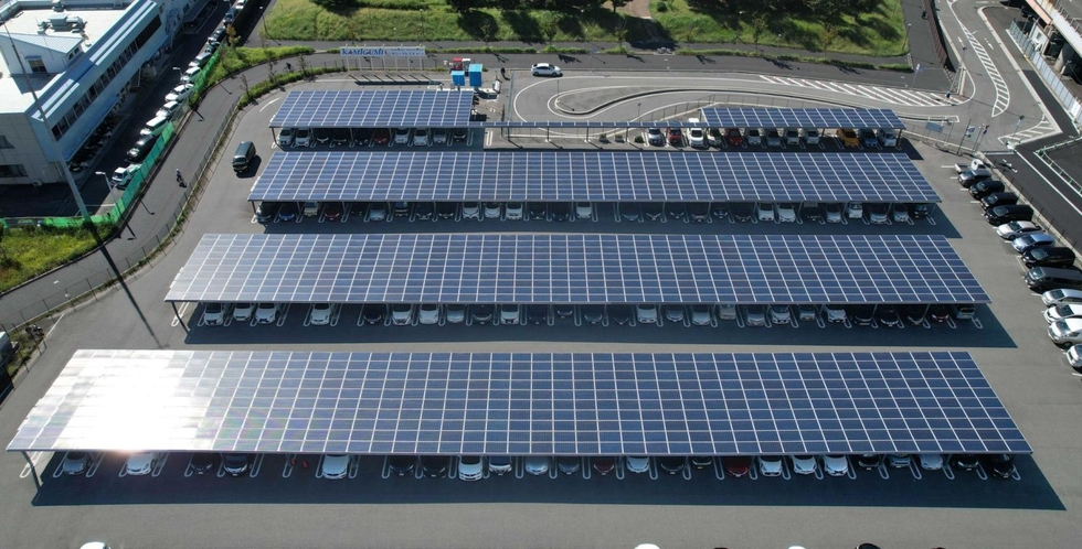 駐車場の屋根を活用した太陽光パネル=神戸市中央区小野浜町(ドローンで撮影)
