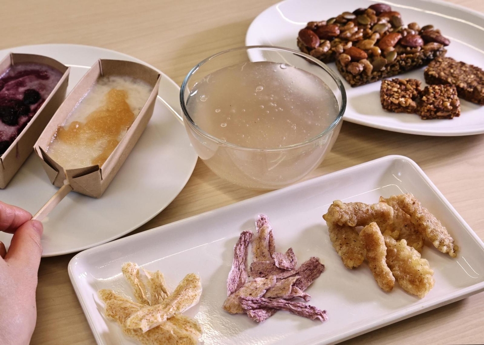 シデカスが手がけるコンニャクペースト(中央)を材料にした(手前右から時計回りに)エビのフリット、野菜ジャーキー、アイスのNinjaバー、ナッツバー=大阪市西淀川区(撮影・長嶺麻子)