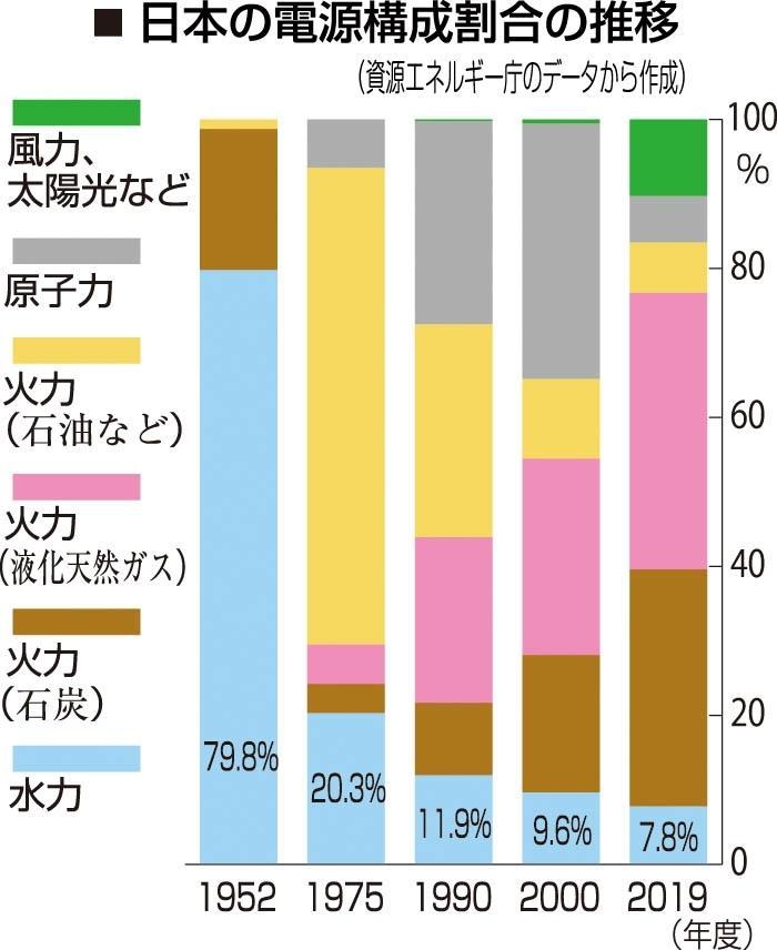 資源エネルギー庁によると、2019年度の電源構成は、天然ガス、石炭、石油を使った火力発電が7割以上を占め、水力発電は7・8%にとどまる。