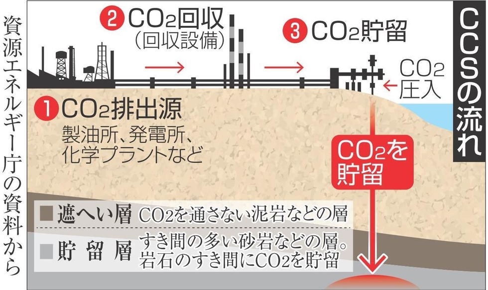 政府は50年に年間1・2億~2・4億トンの貯留を目指し、北海道苫小牧市では、先行して大規模なCCSの実証が進む。地中約1キロと約3キロに計30万トンが貯留され、CO2の漏れや温度変化などを調査中だ。