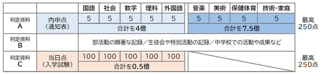 一般入試では、試験問題は全員共通です。また合否の判定は、内申点(通知表の評定)を250点満点換算し、これに当日の5教科の合計点(250点満点に換算)を加えた合計で判定されます。
