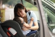チャイルドシートを正しく取り付けたら子どもを乗せ、子ども用ベルトをしっかり締めましょう。「締め付けるとかわいそう」と緩くすると、事故の際に危険です。また、ベルトが首やお腹にかかっていないかも気にしてください。