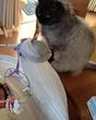 現在、保護猫4匹とブリーダーさんから迎えた子の計5匹と一緒に暮らしています。じっと見つめてくる、目線をそらす、ゆっくり瞬きするなど、本に登場する60の事例は、我が家の猫たちをはじめ、これまで関わってきたすべての猫たちを思い出しながら書きました。執筆中は、パソコンや膝の上に乗ってきたり、ゲラや見本が宅急便で届いた時なんか、箱を目がけて突進してきたり(笑)。院長の夫とともに私を支えてくれました。ゴロゴロ音やふみふみ、お尻で椅子を温めてくれる数々のサポートには特に励まされました(笑)。