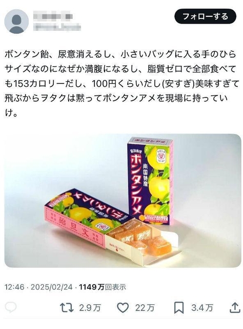 「ボンタンアメ効果で3時間の上映も余裕だった」「ライブ必需品」。X(旧ツイッター)上には、尿意抑制効果を実感したという投稿が相次ぐ。折しも、上映時間が約3時間の邦画「国宝」や約2時間半のアニメ映画「劇場版『鬼滅の刃やいば』無限城編 第一章 猗あ窩か座ざ再来」が大ヒット上映中。ボンタンアメの品切れを告げる店舗の張り紙や、ボンタンアメが大量に並ぶ陳列棚の画像投稿もあり、空前のブームを物語る。