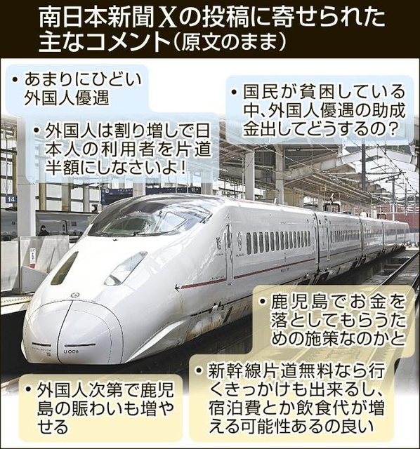 鹿児島県が2026年度一般会計当初予算案に盛り込んだ九州新幹線を活用する訪日誘客策について、「税金は外国人ではなく県民に還元すべき」などの声が南日本新聞や交流サイト(SNS)に寄せられた。博多駅から鹿児島中央駅までの片道分の運賃を全額助成する方針に、「試す価値はある取り組み」と期待する声もあるが、多くは批判的な内容だ。県にも「不公平」「外国人優遇」といった約170件(2月16日時点)の電話やメールがあった。(南日本新聞)