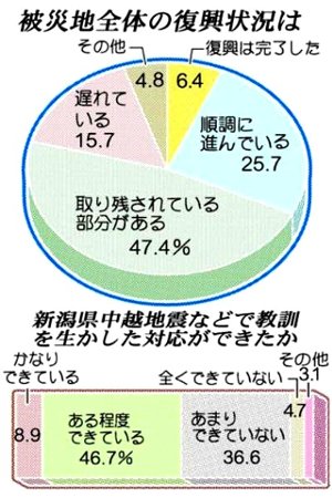 昨年は台風23号や新潟県中越地震などの災害が相次いだ。これらの災害で、行政などが阪神・淡路の教訓を生かした対応ができたかについて、ほぼ半数が「ある程度できている」と評価したが、「あまりできていない」も37%あった。「全くできていない」は5%。